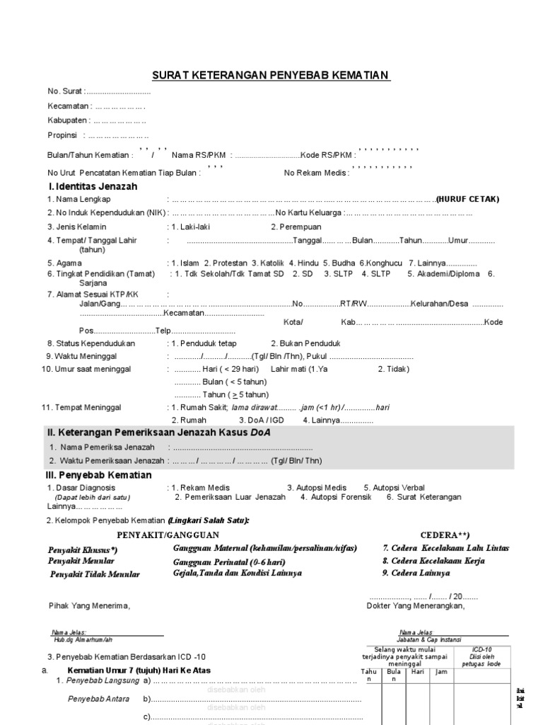 Contoh surat keterangan kematian 1 adalah surat keterangan kematian yang diterbitkan oleh pihak rumah sakit untuk keluarga yang ditinggalkan. Fungsi utama dari penerbitan surat ini adalah untuk menjelaskan dan membenarkan sebuah fakta yang dibutuhkan sebagai data administrasi. Berikut ini adalah beberapa contoh surat keterangan magang dari perusahaan selengkapnya untuk anda. Surat ini biasanya sangat familiar dan juga salah satu jenis surat yang sangat banyak buat hal ini mengingat isi dari surat yang mana isi dari surat keterangan ini umumnya. Surat permohonan pengangkatan pegawai negeri sipil surat pedesaan pemerintah. Contoh surat keterangan penguburan di desa; Surat keterangan kematian biasanya memakai kertas warna kuning, biasanya menerangkan tentang alamat, tanggal hari kematian dan lainnya. Contoh surat kuasa pembuatan akta kematian. Contoh formulir surat keterangan kematian dari rs. Petugas yang ditunjuk di keluarahan akan memeriksa kelengkapan dokumen yang kamu serahkan. Contoh surat kuasa untuk tutup buku rekening bank karena meninggal; Surat keterangan adalah surat yang dibuat untuk menerangkan sesuatu bahkan seseorang. Simak terus artikel ini hingga selesai untuk.